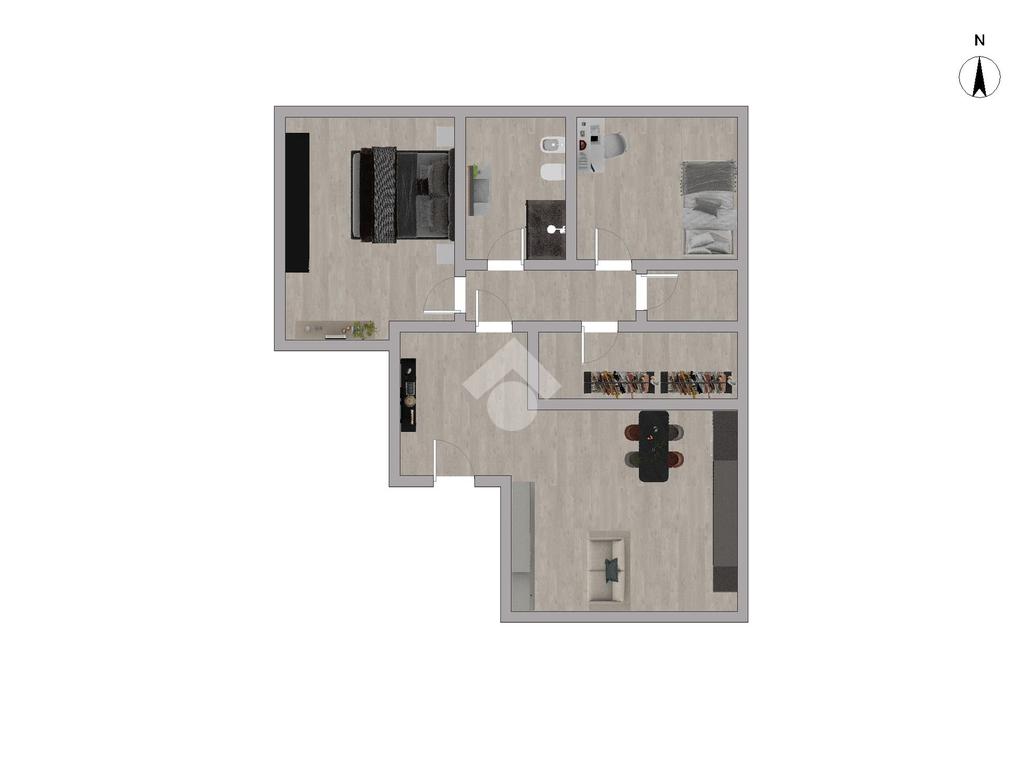 Entrando troviamo un ingresso che accompagna alla zona giorno con cucina lasciata a vista. Un disimpegno, con due pratici ripostigli, conduce invece alla camera matrimoniale e alla cameretta.