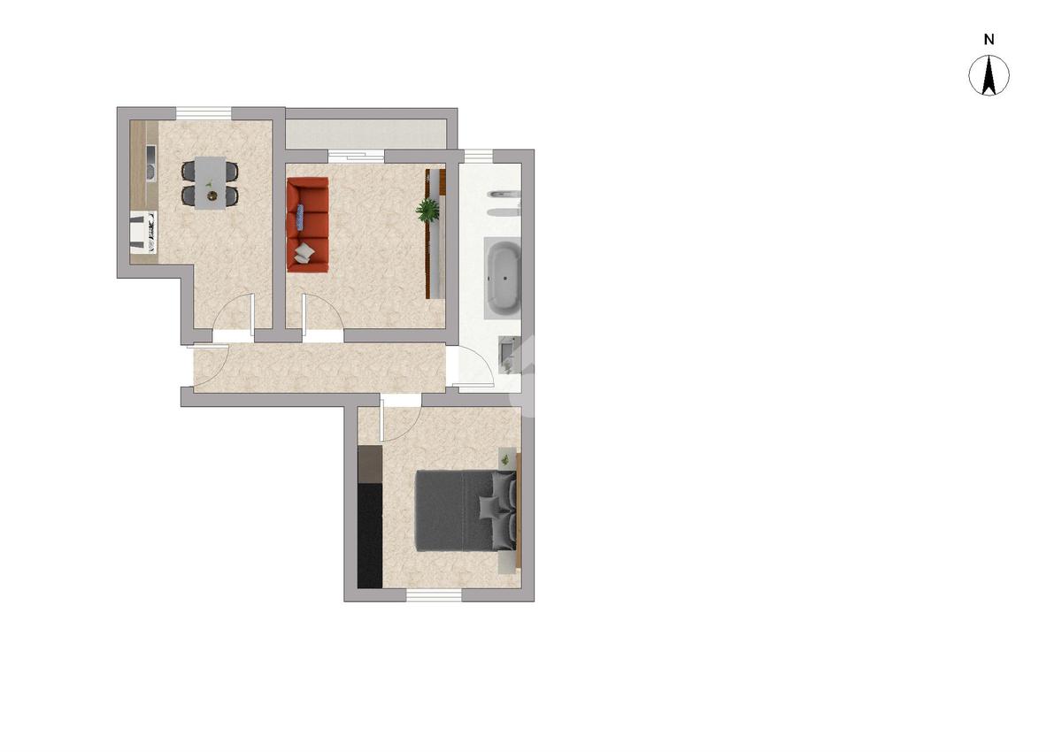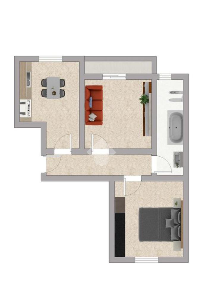 Soggiorno con comodo balcone, spaziosa cucina abitabile, camera matrimoniale e bagno finestrato con vasca.